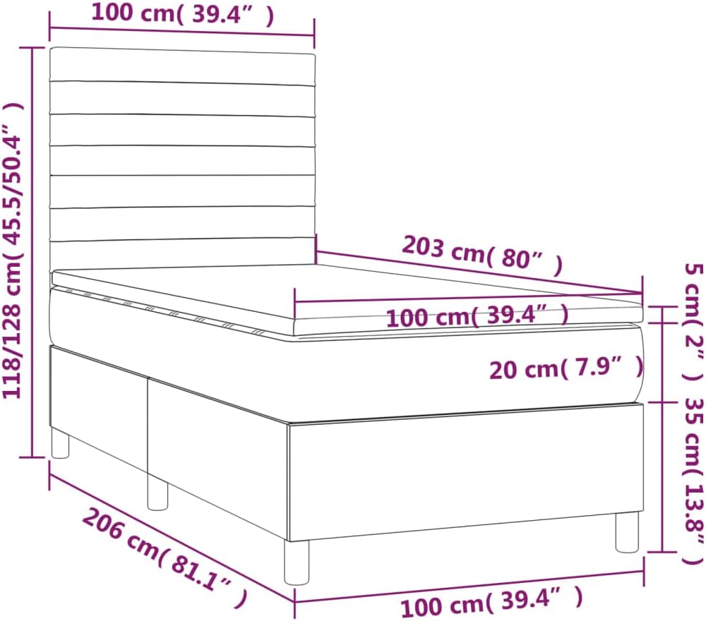 Use this box spring bed with LED to enjoy a restful sleep! It is the focal point of your bedroom. Soft velvet: Velvet is a soft, luxurious fabric that is recognized by its dense pile of evenly cut fibers that have a smooth nap. Velvet fabric features a distinctive soft feel, making it comfortable to touch. Note: Compatible with hygiene reasons, the mattress cannot be returned if the packaging is removed or opened. Only the part with a scissors symbol can be cut and only the part with the USB will continue functioning as before. Each product comes with an assembly manual in the box Compatible with easy assembly. Bed: Color: Light gray Material: Velvet (100% polyester) , plywood, engineered wood, solid larch wood Overall dimensions: 39.4" x 81.1" x 46.5"/50.4" (L x W x H) Bed mattress: Color: White and light gray Material: Velvet (100% polyester) Filling material: Pocket springs, foam Dimensions: 39.4" x 79.9" x 7.9" (W x L x H) (Twin XL) Bed mattress topper: Color: White Topper material: Fabric (100% polyester) Filling material: Foam Dimensions: 39.4" x 79.9" x 2" (W x L x H) LED strip: Length: 21.7" Power: 5 V USB cable length: 59.1" Power cable length: 11.8" IP rating: IP65 With scissor cuttable symbol Delivery contains: 1 x Bed frame 1 x Headboard 1 x Mattress 1 x Mattress topper 1 x LED strip