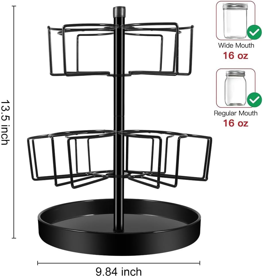 Revolutionize Your Kitchen Storage with the Picowe Rotating Mason Jar Rack! Tired of cluttered cabinets and disorganized countertops? Meet the Picowe 2-Tier Rotating Mason Jar Organizer, the smart and stylish solution for storing your 16 oz Mason jars. Whether you're an avid canner, a meal-prep enthusiast, or simply love the classic Mason jar aesthetic, this rack is designed to bring effortless order and convenience to your home. Why You'll Love Our Jar Rack: Smooth-Spinning Convenience: The innovative rotating base allows you to spin the entire rack for 360-degree access. No more digging through piles or reaching to the back of the shelf—your favorite jar is always just a spin away. Holds All Your Jars: This rack is universally compatible, securely cradling both Wide Mouth and Regular Mouth 16 oz (Pint) canning jars. Its versatile design makes it an indispensable organizer for any kitchen. Built to Last: Crafted with strength and stability in mind, this rack provides a sturdy home for your glass jars. Feel confident loading it up, knowing it won't wobble or collapse under the weight. More Than Just Canning: While perfect for your canning needs, this organizer's usefulness extends far beyond. Use it to sort dry goods, create a charming coffee station, organize craft supplies, or keep your daily drinking glasses tidy on the dining table.