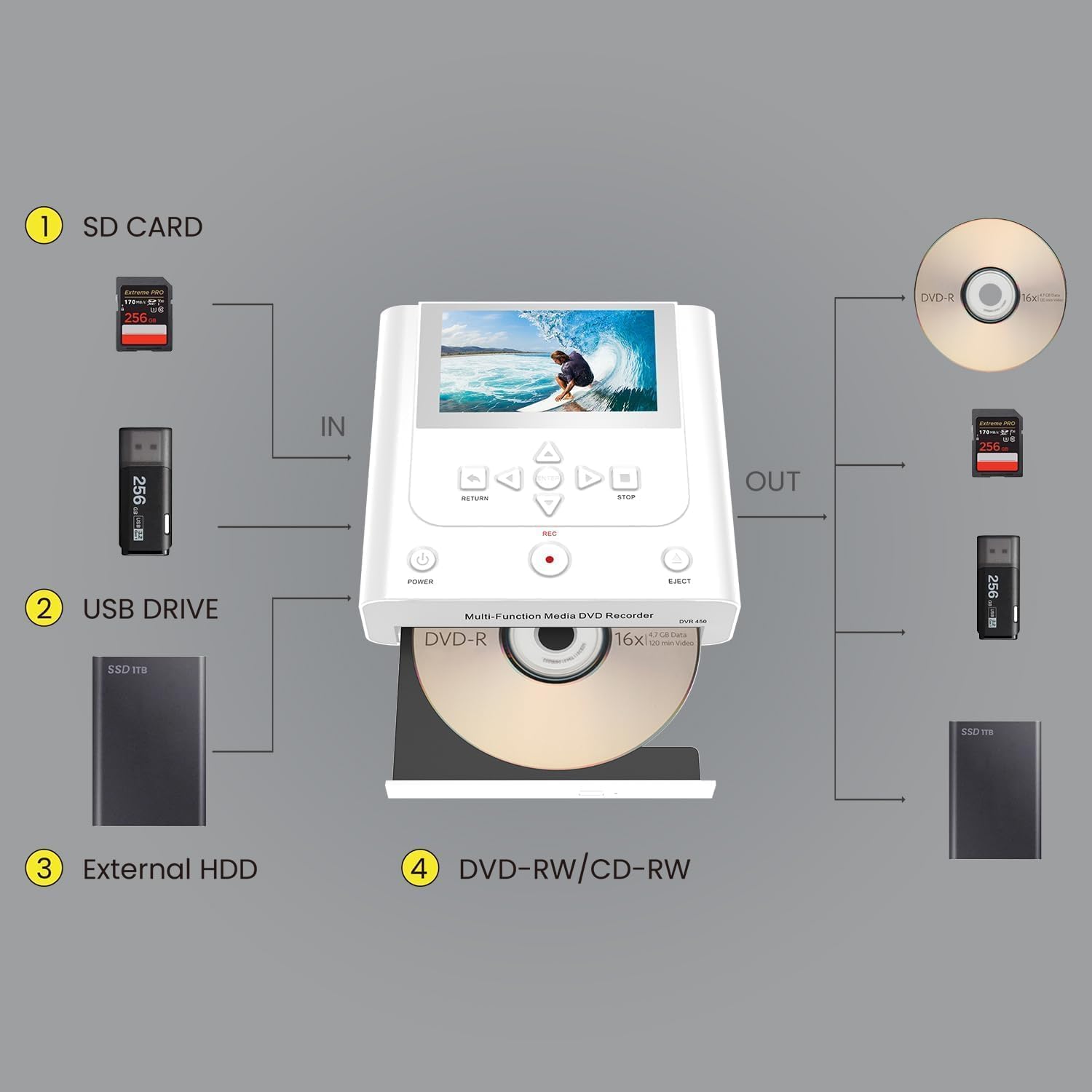 Note: VHS to digital converter comes from VHS, VCR, DVD, CD, camcorder, SD card, USB, TV, smartphone video/audio (VHS to digital converter itself can not be used as a player for devices such as VHS or DVD etc.), some of the devices such as VHS, camcorder need to be used with an RCA cable linking to the burner. The time required for the burner to burn is equal to the length of the video to be burned, e.g. 3 hours of video, the length of the burn is also equal to 3 hours. Please make sure that your DVD memory is sufficient to burn the video, when the DVD memory is full, it will be ejected automatically and the video will not be burned completely.